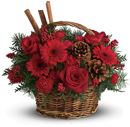 A handled basket of red flowers including roses, red gerbera daisies and carnations is topped with festive cinnamon sticks.